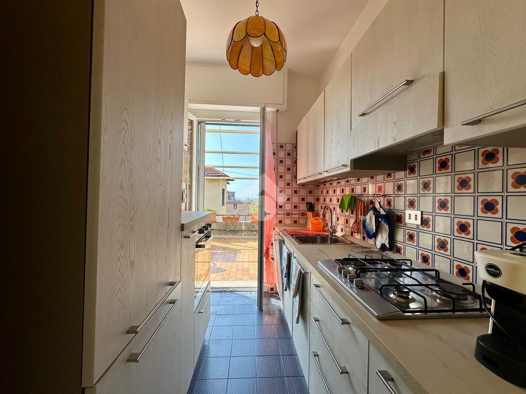 L’ingresso si apre su un luminoso soggiorno, adiacente alla cucina ; entrambi gli ambienti hanno accesso diretto al terrazzo esterno, perfetto per momenti di relax all’aperto.