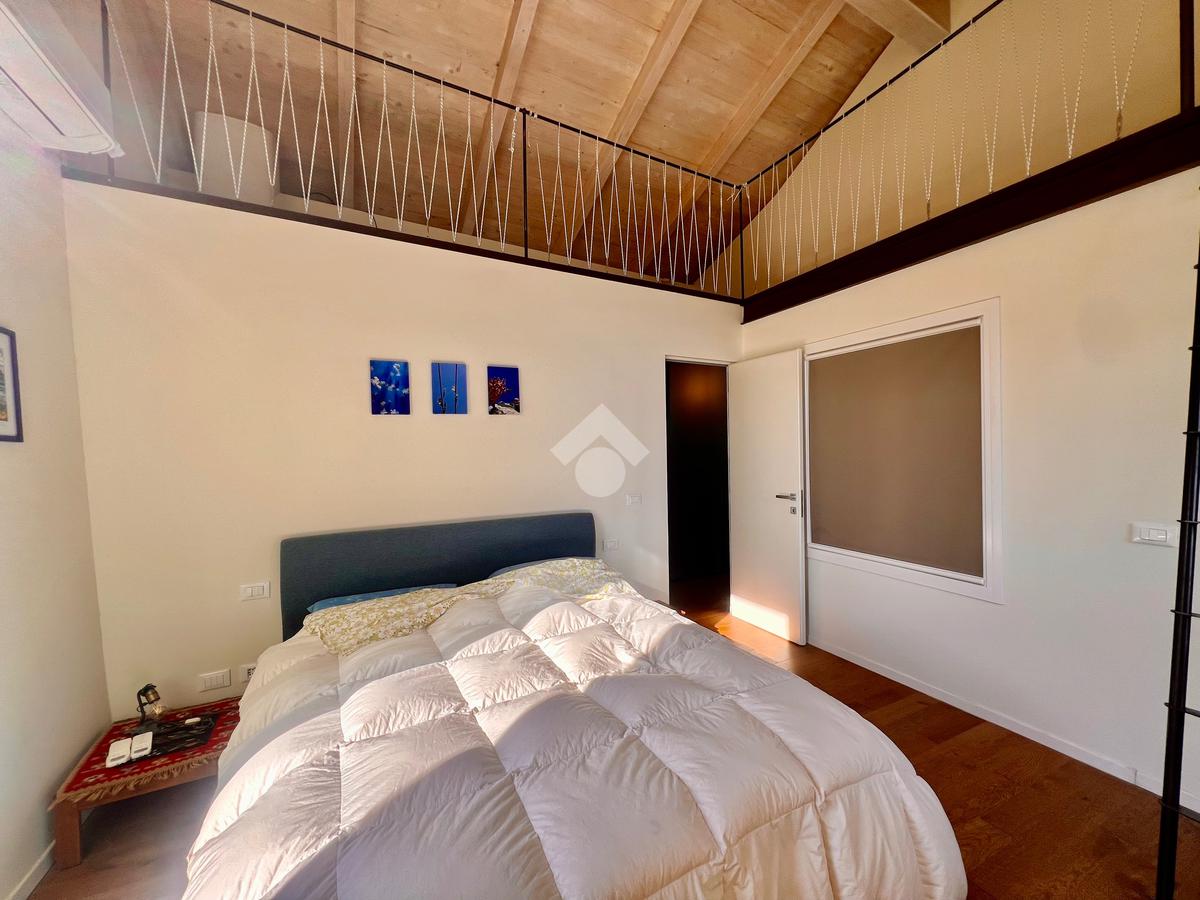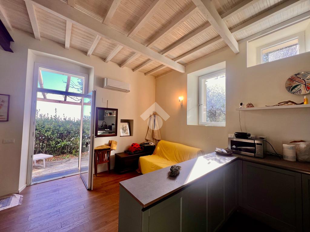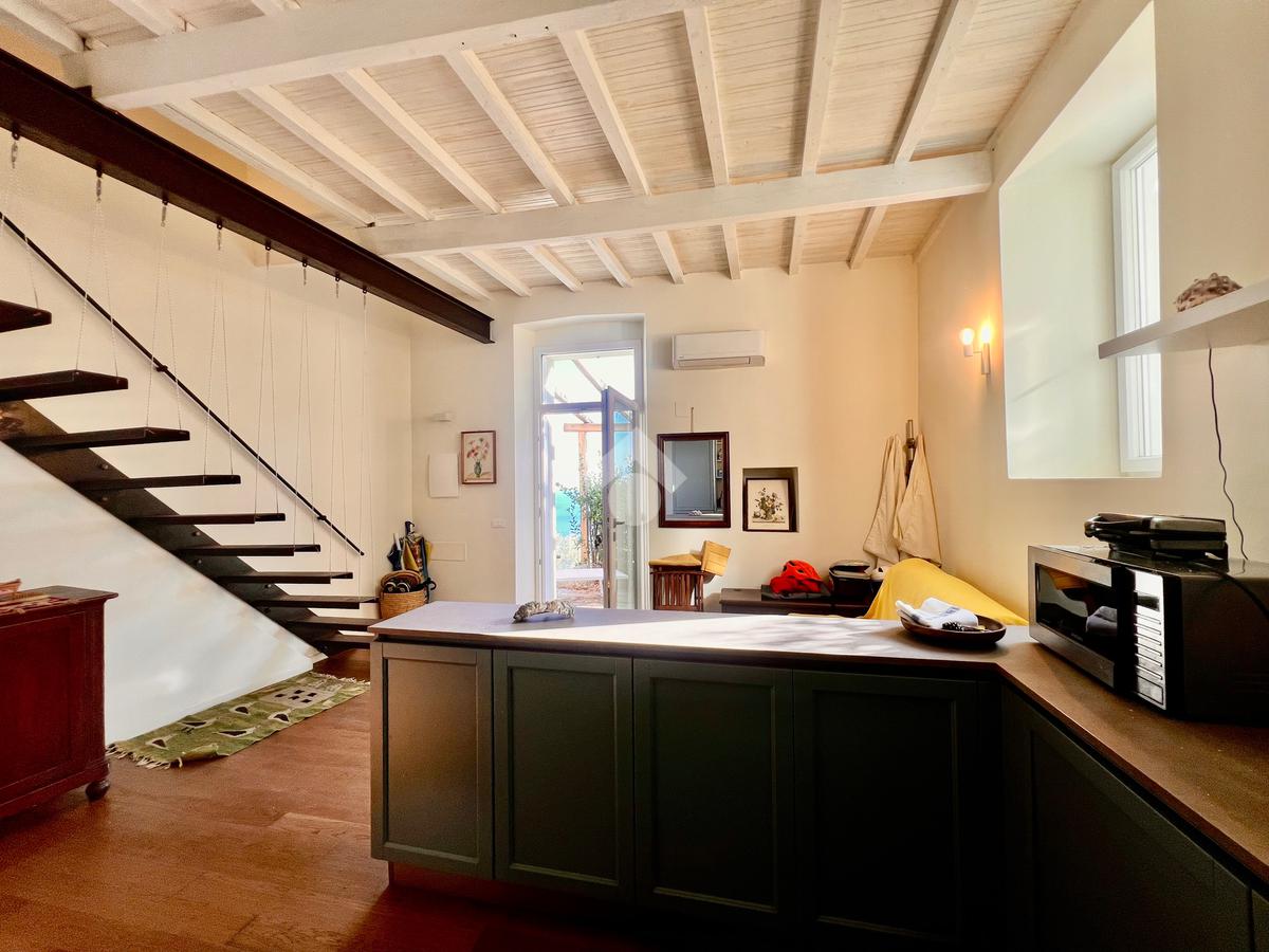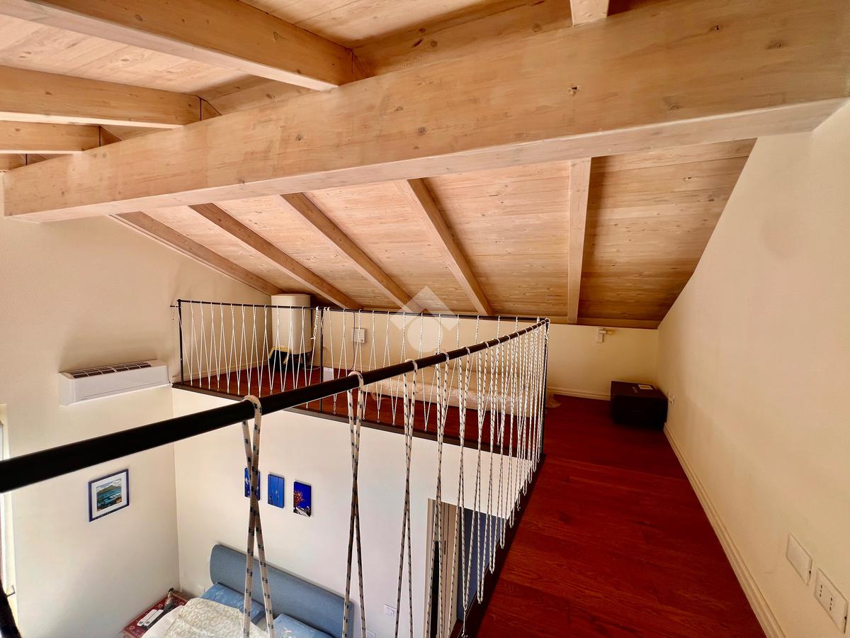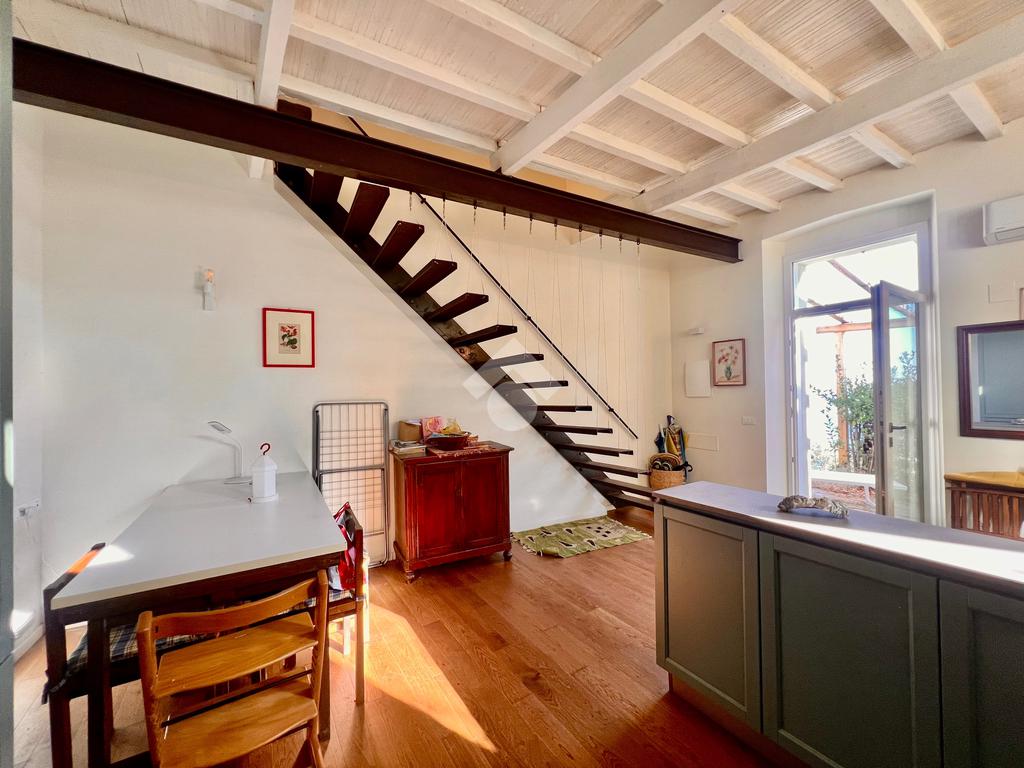 L'ingresso è sul luminoso soggiorno con angolo cottura e uscita su un ampio giardino. La zona notte al piano superiore, accessibile tramite scala interna è composta da una camera da letto con comodo soppalco con un ulteriore posto letto , da una cabina armadi e un bagno finestrato e dotato di doccia.
